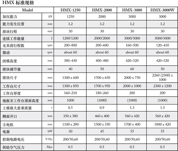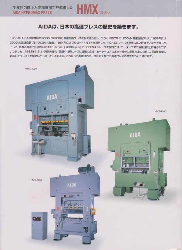 HMX系列高速自动冲床 --应用更广泛的精密高速冲床 冲床特点: - 能够在高速运转情况下进行长时间连续工作。 - AIDA 会田在丰富的实践经验基础上,将回转部和滑动部设置了适合的油槽和间隙。 - 加上全自动润滑系统的采用,成功地减少维修成本,提高机械精度和长时间高速运转的稳定性。 - 安装了辊式送料装置实现了高速运转情况下准确而均匀地输送材料,提高产品合格率并降低材料成本。 冲床优势: 1. 采用高刚性机架以及抑制倾斜的8面预加载导轨,实现高精度加工。 2. 多年积累的技术和经验造就了高速加工技术。 3. 工作能力3000kN时还可实现宽泛的加工范围(2300mm)。